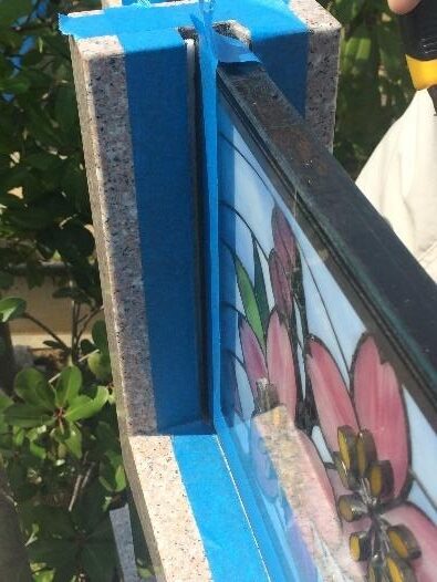 石とガラスの間に必ず5㎜程のクリアランスを設けて下さい。石との間でガラスの重さがかかる場所にはゴムパッキン(3~㎜厚推奨)を敷いてガラスが石に触れないようにしてください。重みがかからない場所はバックアップ材を詰めてガラスが動かないようにしてから隙間にシリコン系のコーキング材のみを使用して接着してください。接着にはボンド等完全に硬化する物は絶対に使用しないでください。接着材が原因で割れてしまう事がある為、必ず守って下さい。施工方法を紹介する動画や資料をご用意しております。