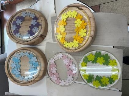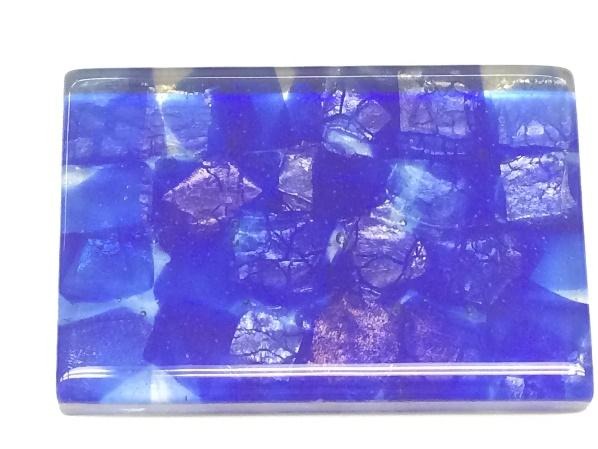 キャストガラスとは耐火石膏等の型に入れたガラスに熱を加えて一度溶かしたものを冷ます事で成形したガラスの事です。かわさきガラスのキャストガラスの基本ラインナップは約2cm角の色ガラス片を散りばめたもので、赤、青、緑、黄、ピンク、紫の6色があります。異なる色を組合せて作成することやガラス片のサイズを1cm角程度に小さくしたりすることも可能です。
